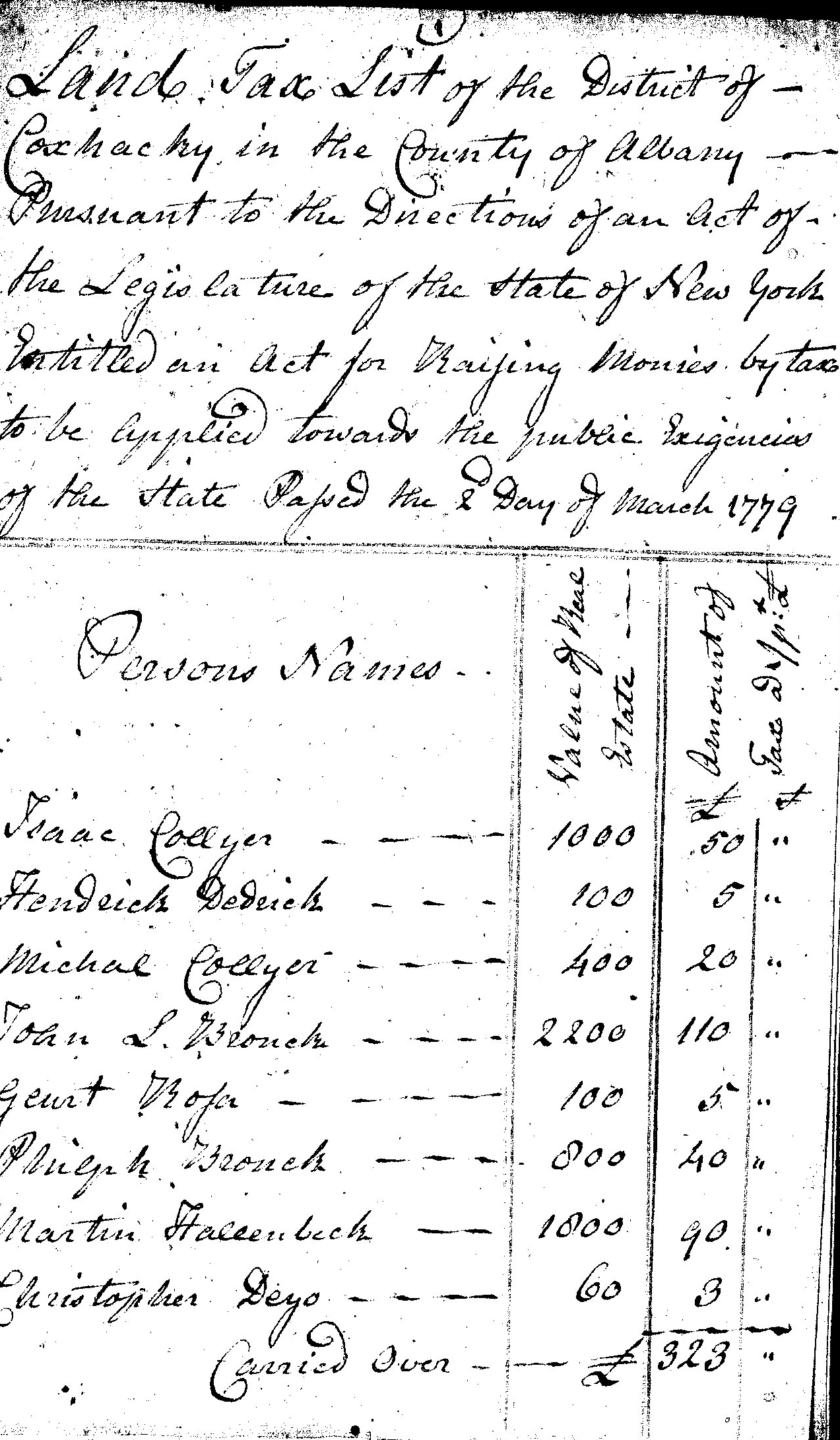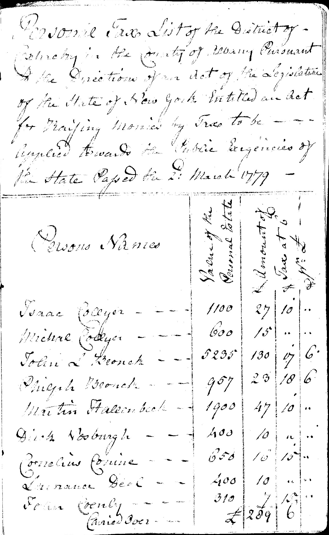 Personal Tax List of the District of Coxhacky in the County of Albany Pursuant to the Direction of an Act of the Legislature of the State of New York "Entitled an Act for Raising monies by Tax to be applied towards the Public Exigencies of the State Passed the 2d March 1779